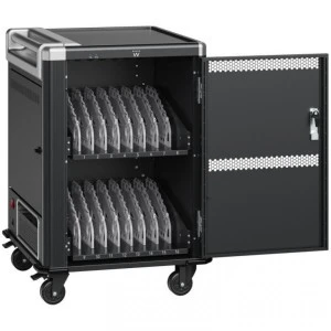 Profesjonalna, wysokiej klasy mobilna szafa do bezpiecznego przechowywania i jednoczesnego ładowania do 16 notebooków, laptopów do 15.6" lub tabletów. Wyposażona w system inteligentnego ładowania, system organizacji urządzeń oraz ich okablowania, z ochroną przed przeciążeniem i zwarciem. Gotowa to wdrożenia i natychmiastowej pracy w instytucjach edukacyjnych czy środowiskach korporacyjnych.