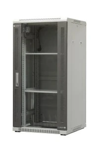 Zaawansowany model szaf teleinformatycznych rack stojących z bogatym wyposażeniem. Drzwi przednie z wklejoną szybą hartowaną i zamkiem 1-punktowym wyposażonym w dźwignię obrotową zamontowane na zawiasach umożliwiających otwarcie drzwi o 180 stopni. Drzwi tylne oraz dwie ściany boczne z blachy stalowej, zdejmowane, mocowane przy pomocy zamków jednopunktowych. 3 poziome trawersy służące do mocowania pionowych profili. 4 pionowe profile montażowe, minimalna odległość od drzwi przednich 35mm (standardowo 95mm). Konstrukcja szafy wykonana z blachy stalowej. Rama skręcana z profili stalowych, przystosowana do ustawienia na nóżkach poziomych lub montowana na cokole. W dachu panel wentylacyjny, 2 lub 4 wentylatory. Rama zawiera trzy otwory wprowadzające do kabli (300x40mm). 4 nóżki poziomujące. Możliwość regulacji położenia co 20 mm. Linka uziemiająca na wyposażeniu. Półki stałe mocowane w 4 punktach, 20 śrub montażowych oraz komplet 2 wentylatorów (szafy 24U, 32U i 42U 600x600) lub 4 wentylatorów (pozostałe rozmiary szaf) i termostat w standardowym wyposażeniu. Szafy rackowe przeznaczone są do stosowania wewnątrz pomieszczeń. Możliwość ustawienia na cokołach. Szafy stojące dostarczane są kompletnie zmontowane na palecie drewnianej, zapakowane w karton (czapy kartonowe na dachu, narożniki kartonowe i osłony boczne z kartonu), owinięte folią stretch. Możliwość łączenia szaf w rzędy (z wykorzystaniem łącznika do szaf z serii EmiterNet). Możliwość zastosowania kół jezdnych (przy zastosowaniu kółek jezdnych maksymalna nośność statyczna nie może przekraczać 150 kg).