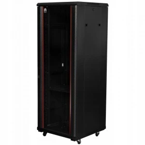 W zestawie z szafą RACK znajduje się czarna, perforowana półka. Perforacja zapewnia lepszą cyrkulację powietrza, co jest kluczowe dla utrzymania odpowiedniej temperatury wewnątrz szafy i zapobiega przegrzewaniu się urządzeń.