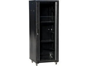 Szafa teletechniczna RACK, stojąca, 19", do stosowania wewnątrzbudynkowego przeznaczona do montażu elementów pasywnych i aktywnych okablowania strukturalnego, zasilania awaryjnego oraz CCTV. Drzwi przednie wyposażone są w zamek zapobiegający dostępowi przez osoby niepowołane. Osłony boczne posiadają zatrzaski ułatwiające ich demontaż oraz zamek. Elementy szafy są malowane proszkowo. Możliwość zamontowania cokołu lub kółek jezdnych - opcja.