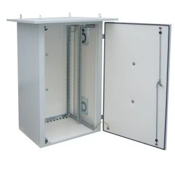 Termo izolowana szafa Solarix LC-07 przeznaczona jest do instalacji komponentów okablowania strukturalnego w warunkach zewnętrznych. Szkielet szafki LC-07 składa się z ramy pospawanej z pełnym zadaszeniem. W tylnej ściance przygotowane są otwory do zawieszenia na ścianie. Przednie drzwi wykonane są z pełnej blachy, do ich zamykania służy klamka, zamek bębenkowy i 3 punktowy rygiel. Ścianki boczne mogą posiadać dodatkowe otwory do montażu wentylatorów. Zadaszenie, które jest częścią szkieletu chroni zainstalowane komponenty przed deszczem i bezpośrednimi promieniami słonecznymi. aby ułatwić transport i manipulację szafą wyposażono ją w 4 oka umożliwiające jej uchwyceni hakami. Wprowadzenie kabli realizowane jest przez przepusty kablowe znajdujące się w dnie szafki. Standardowo szafka wyposażona jest w dwie pary regulowanych szyn 19". Szafka jest w całości termo izolowana. Pokrywana jest farbą proszkową szarą RAL 7035 o grubości warstwy od 80 do 120 mikronów. Inne kolory RALna zamówienie. W przypadku montażu jako szafki stojącej należy użyć podstawy aby osadzić ją na podłożu. Konstrukcja • termo izolowany spawany szkielet • solidne stalowe drzwi przednie z izolacją termiczną, klamką, zamkiem cylindrycznym i zamknięciem trzypunktowym • drzwi mogą być otwierane do kąta 180°, do wyboru lewe lub prawe otwieranie • ścianki boczne z otworami na wentylatory • 12 przepustów kablowych PG-16 w dnie szafki • 2 pary przesuwnych 19" szyn pionowych • zadaszenie z oczkami dla łatwiejszej manipulacji • nośność 100 kg • stopień ochrony: IP 55 – ściany boczne pełne • stopień ochrony: IP 43 – ściany boczne z wentylatorami