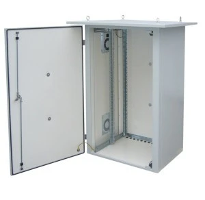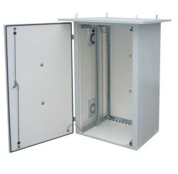 Termo izolowana szafa Solarix LC-07 przeznaczona jest do instalacji komponentów okablowania strukturalnego w warunkach zewnętrznych. Szkielet szafki LC-07 składa się z ramy pospawanej z pełnym zadaszeniem. W tylnej ściance przygotowane są otwory do zawieszenia na ścianie. Przednie drzwi wykonane są z pełnej blachy, do ich zamykania służy klamka, zamek bębenkowy i 3 punktowy rygiel. Ścianki boczne mogą posiadać dodatkowe otwory do montażu wentylatorów. Zadaszenie, które jest częścią szkieletu chroni zainstalowane komponenty przed deszczem i bezpośrednimi promieniami słonecznymi. aby ułatwić transport i manipulację szafą wyposażono ją w 4 oka umożliwiające jej uchwyceni hakami. Wprowadzenie kabli realizowane jest przez przepusty kablowe znajdujące się w dnie szafki. Standardowo szafka wyposażona jest w dwie pary regulowanych szyn 19". Szafka jest w całości termo izolowana. Pokrywana jest farbą proszkową szarą RAL 7035 o grubości warstwy od 80 do 120 mikronów. Inne kolory RALna zamówienie. W przypadku montażu jako szafki stojącej należy użyć podstawy aby osadzić ją na podłożu. Konstrukcja • termo izolowany spawany szkielet • solidne stalowe drzwi przednie z izolacją termiczną, klamką, zamkiem cylindrycznym i zamknięciem trzypunktowym • drzwi mogą być otwierane do kąta 180°, do wyboru lewe lub prawe otwieranie • ścianki boczne z otworami na wentylatory • 12 przepustów kablowych PG-16 w dnie szafki • 2 pary przesuwnych 19" szyn pionowych • zadaszenie z oczkami dla łatwiejszej manipulacji • nośność 100 kg • stopień ochrony: IP 55 – ściany boczne pełne • stopień ochrony: IP 43 – ściany boczne z wentylatorami