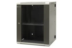 W dachu szafy otwory przystosowane do montażu modułów wentylacyjnych 1-wentylatorowych. Linka o długości 300mm do uziemienia. Półka stała 280mm oraz 15 śrub montażowych w standardowym wyposażeniu. Szafy przeznaczone są do stosowania wewnątrz pomieszczeń. Drzwi przednie z wklejoną szybą hartowaną i zamkiem 1-punktowym, zamontowane na zawiasach umożliwiających otwieranie drzwi o 180 stopni. Ściana tylna z blachy stalowej z zamkiem 1-punktowym, mocowana przy pomocy zawiasów umożliwiających otwieranie szafy o 180 stopni. Zdejmowane osłony boczne z zamkiem. Dwie płaszczyzny 19” pionowych profili montażowych (rack) , mocowane na poziomych trawersach z rastrem, co 20 mm, minimalna odległość od drzwi przednich 35 mm (standardowo 65mm). Szafa teleinformatyczna wykonana z blachy stalowej, konstrukcja spawana, o dużej sztywności (większej niż w przypadku modeli szaf skręcanych). Obudowa posiada cztery otwory wyprowadzające do kabli (340x60mm 2xczęść górna, 2xczęść dolna).