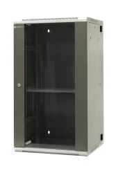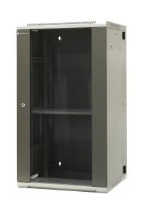 Obudowa posiada cztery otwory wyprowadzające do kabli (340x60mm 2xczęść górna, 2xczęść dolna). Zdejmowane osłony boczne z zamkiem. Szafa teleinformatyczna wykonana z blachy stalowej, konstrukcja spawana, o dużej sztywności (większej niż w przypadku modeli szaf skręcanych). Linka o długości 300mm do uziemienia. Półka stała 280mm oraz 15 śrub montażowych w standardowym wyposażeniu. Szafy przeznaczone są do stosowania wewnątrz pomieszczeń. Drzwi przednie z wklejoną szybą hartowaną i zamkiem 1-punktowym, zamontowane na zawiasach umożliwiających otwieranie drzwi o 180 stopni. Ściana tylna z blachy stalowej z zamkiem 1-punktowym, mocowana przy pomocy zawiasów umożliwiających otwieranie szafy o 180 stopni. Dwie płaszczyzny 19” pionowych profili montażowych (rack) , mocowane na poziomych trawersach z rastrem, co 20 mm, minimalna odległość od drzwi przednich 35 mm (standardowo 65mm). W dachu szafy otwory przystosowane do montażu modułów wentylacyjnych 1-wentylatorowych.