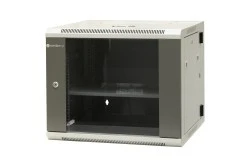 Ściana tylna z blachy stalowej z zamkiem 1-punktowym, mocowana przy pomocy zawiasów umożliwiających otwieranie szafy o 180 stopni. Zdejmowane osłony boczne z zamkiem. Dwie płaszczyzny 19” pionowych profili montażowych (rack) , mocowane na poziomych trawersach z rastrem, co 20 mm, minimalna odległość od drzwi przednich 35 mm (standardowo 65mm). W dachu szafy otwory przystosowane do montażu modułów wentylacyjnych 1-wentylatorowych. Szafa teleinformatyczna wykonana z blachy stalowej, konstrukcja spawana, o dużej sztywności (większej niż w przypadku modeli szaf skręcanych). Obudowa posiada cztery otwory wyprowadzające do kabli (340x60mm 2xczęść górna, 2xczęść dolna). Drzwi przednie z wklejoną szybą hartowaną i zamkiem 1-punktowym, zamontowane na zawiasach umożliwiających otwieranie drzwi o 180 stopni. Linka o długości 300mm do uziemienia. Półka stała 280mm oraz 15 śrub montażowych w standardowym wyposażeniu. Szafy przeznaczone są do stosowania wewnątrz pomieszczeń.