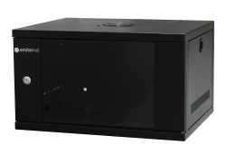 Zdejmowane osłony boczne (bez zamka). Możliwość przełożenia drzwi do otwierania w drugą stronę. Drzwi przednie z wklejoną szybą hartowaną i zamkiem 1-punktowym, zamontowane na zawiasach umożliwiających otwieranie drzwi o 180 stopni. Szafa wykonana z blachy stalowej, konstrukcja spawana, o dużej sztywności (większej niż w przypadku modeli szaf skręcanych). Obudowa posiada dwa otwory wyprowadzające do kabli (340x65mm1xczęść górna, 1xczęść dolna). W tylnej ścianie 4 otwory o średnicy 12 mm do zawieszenia szafy, w odstępach 400x115mm. Dwie płaszczyzny 19” pionowych profili montażowych, mocowane na poziomych trawersach. Maksymalny rozstaw profili: 380mm (standardowo 250mm). W dachu szafy otwory przystosowane do montażu jednego modułu wentylacyjnego 1-wentylatorowego.