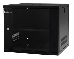 W dachu szafy otwory przystosowane do montażu jednego modułu wentylacyjnego 1-wentylatorowego. W tylnej ścianie 4 otwory o średnicy 12 mm do zawieszenia szafy, w odstępach 400x115mm. Dwie płaszczyzny 19” pionowych profili montażowych, mocowane na poziomych trawersach. Maksymalny rozstaw profili: 380mm (standardowo 250mm). Drzwi przednie z wklejoną szybą hartowaną i zamkiem 1-punktowym, zamontowane na zawiasach umożliwiających otwieranie drzwi o 180 stopni. Obudowa posiada dwa otwory wyprowadzające do kabli (340x65mm1xczęść górna, 1xczęść dolna). Możliwość przełożenia drzwi do otwierania w drugą stronę. Zdejmowane osłony boczne (bez zamka). Szafa wykonana z blachy stalowej, konstrukcja spawana, o dużej sztywności (większej niż w przypadku modeli szaf skręcanych).