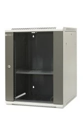 Drzwi przednie z wklejoną szybą hartowaną i zamkiem 1-punktowym, zamontowane na zawiasach umożliwiających otwieranie drzwi o 180 stopni. Zdejmowane osłony boczne z zamkiem. Szafa wykonana z blachy stalowej, konstrukcja spawana, o dużej sztywności (większej niż w przypadku modeli szaf skręcanych). Obudowa posiada dwa otwory wyprowadzające do kabli (340x60mm 1xczęść górna, 1xczęść dolna).Dwie płaszczyzny 19” pionowych profili montażowych, mocowane na poziomych trawersach z rastrem, co 20 mm, minimalna odległość od drzwi przednich 35 mm (standardowo 65mm). Linka o długości 300mm do uziemienia. Półka stała 410mm oraz 15 śrub montażowych w standardowym wyposażeniu. Szafy przeznaczone są do stosowania wewnątrz pomieszczeń. W dachu szafy otwory przystosowane do montażu modułów wentylacyjnych 1-wentylatorowych.