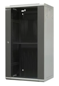 Półka stała 280mm oraz 15 śrub montażowych w standardowym wyposażeniu. Linka o długości 300mm do uziemienia. Obudowa posiada dwa otwory wyprowadzające do kabli (340x60mm 1xczęść górna, 1xczęść dolna). Dwie płaszczyzny 19” pionowych profili montażowych (rack), mocowane na poziomych trawersach z rastrem, co 20 mm, minimalna odległość od drzwi przednich 35 mm (standardowo 65mm). Zdejmowane osłony boczne z zamkiem. W dachu szafy otwory przystosowane do montażu modułów wentylacyjnych 1-wentylatorowych. Drzwi przednie z wklejoną szybą hartowaną i zamkiem 1-punktowym, zamontowane na zawiasach umożliwiających otwieranie drzwi o 180 stopni. Szafy przeznaczone sa do stosowania wewnątrz pomieszczeń. Szafa teleinformatyczna wykonana z blachy stalowej, konstrukcja spawana, o dużej sztywności (większej niż w przypadku modeli szaf skręcanych).