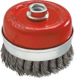Szczotka druciana GRAPHITE (nr ref. 57H587) o średnicy 100 mm wykonana z drutu ze stali nierdzewnej o grubości 0.5 mm. Wzmocniona konstrukcja korpusu pozwala na wydajne czyszczenie konstrukcji stalowych ze stali nierdzewnej i stali kwasoodpornej. Mocowanie przystosowane do współpracy ze szlifierkami kątowymi.