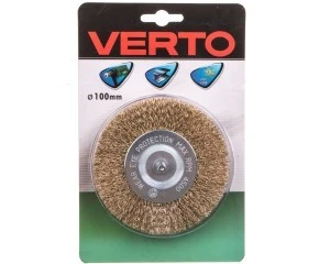 Szczotka druciana VERTO (nr ref. 62H321) o średnicy 100 mm, wykonana z drutu stalowego mosiądzowanego o grubości 0.33 mm. Wzmocniona konstrukcja korpusu pozwala na wydajne czyszczenie konstrukcji stalowych. Mocowanie przystosowane do współpracy z wiertarkami. Marka VERTO oferuje asortyment elektronarzędzi i akcesoriów dla każdego majsterkowicza.