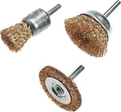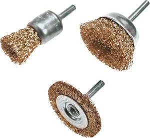Szczotki druciane VERTO (nr ref. 62H613) zestaw 3 sztuki, z drutu stalowego, karbowanego, mosiądzowanego, służące do oczyszczania powierzchni drewnianych i metalowych z brudu, rdzy, powłok lakierniczych. Trzpień o średnicy 6 mm pozwala mocować szczotki we wrzecionach wiertarek i wkrętarek. Marka VERTO oferuje asortyment elektronarzędzi i akcesoriów dla każdego majsterkowicza.
