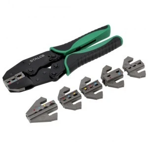 Szczypce do zaciskania z wymiennymi szczękami, 6 kpl.szczęk, pozwalające na dowolny wybór matryc zaciskających, co umożliwia dostosowanie narzędzia do indywidualnych potrzeb. Pełna gama szczęk pozwala na obsługę większości końcówek występujących w mechanice samochodowej, telekomunikacji, elektronice i innych pracach monterskich.