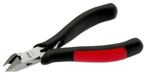 Szczypce do cięcia ukośnego dla elektroników z funkcją usuwania izolacji z przewodów, średnica 1,0 mm=0,8 mm², precyzyjne szczypce dla elektroników z przegubem skrzynkowym, kute matrycowo, precyzyjna konstrukcja ze specjalnej stali, łatwe samoczynne otwieranie dzięki podwójnym sprężynom ostrzy, długa żywotność, precyzyjnie szlifowane powierzchnie, z ergonomicznymi dwukomponentowymi uchwytami (na życzenie w wersji ESD lub 1000 V), z szeroką krawędzią tnącą, bez skosu, kąt 37°, 120 mm