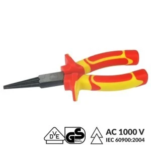 Szczypce okrągłe elektrotechniczne VDE 1000V. Posiadają wielokomponentową rękojeść z certyfikatem VDE, która zapewnia izolację do 1000V. Można używać ich podczas wszelkich prac przy instalacjach niskonapięciowych do 1kV. Szczypce okrągłe to narzędzie ręczne przeznaczone do obróbki elementów metalowych. Wykorzystasz je do kształtowania oraz zaginania drutów, prętów przewodów oraz cienkich blaszek.