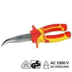 Szczypce wydłużone odgięte elektrotechniczne VDE 1000V. Posiadają wielokomponentową rękojeść z certyfikatem VDE, która zapewnia izolację do 1000V. Można używać ich podczas wszelkich prac przy instalacjach niskonapięciowych do 1kV.