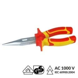 Szczypce wydłużone proste elektrotechniczne VDE 1000V. Posiadają wielokomponentową rękojeść z certyfikatem VDE, która zapewnia izolację do 1000V. Można używać ich podczas wszelkich prac przy instalacjach niskonapięciowych do 1kV.