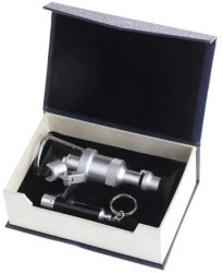 Futerał z wyściółką piankową. Mierniki kieszonkowe. Skala pomiarowa Kubki z gumowymi oczkami Pierścień regulacji ostrości Obramowanie obiektu akrylowego Minilatarka montowana z boku (baterie nie są dołączone do zestawu) Minilatarka wymaga 3 baterii alkalicznych 1,5 V SR44 Maksymalna wysokość: 145 mm Średnica podstawy akrylowej: 45 mm