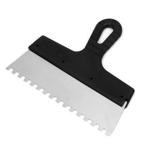 Metalowa paca zębata posiada niezbędną sztywność i elastyczność, co pozwala na równomierne rozprowadzenie kleju na powierzchni. Ząbkowana krawędź o podziałce 8 x 8 mm tworzy idealną warstwę zaprawy, zapewniając niezawodną przyczepność płytek do podłoża.