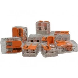 Szybkozłączka instalacyjna WAGO uniwersalna serii 221 COMPACT wyposażona w zacisk CAGE CLAMP przeznaczona do łączenia przewodów jednodrutowych (tzw. drut) oraz wielodrutowych (tzw. linka).