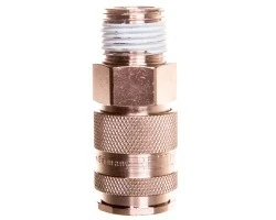 Szybkozłączka z gwintem zewnętrznym. Gwint G1/2. Średnica Dn10. Szybkozłączki i króćce służą do szybkiego łączenia i rozłączania przewodów w instalacjach pneumatycznych. Po rozłączeniu przewodu następuje odcięcie przepływu medium roboczego co nie powoduje strat ciśnienia w układzie. Szybkozłączki i króćce szczególnie nadają się do podłączania narzędzi pneumatycznych, oraz do stosowania w warsztatach samochodowych. Zakres temperatur pracy: od 0 do + 80°C. Maksymalnie ciśnienie pracy: 2,0 MPa.