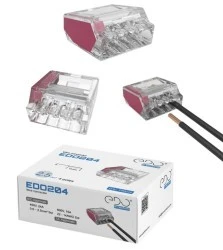 Złączki instalacyjne marki EDO to łatwe w użyciu i bezpieczne rozwiązania do łączenia przewodów w instalacjach elektrycznych. Stosowane m. in. w rozdzielniach elektrycznych, skrzynkach przyłączeniowych, puszkach instalacyjnych, instalacjach przemysłowych i systemach oświetleniowych.