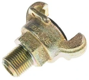 Złącze zaciskowe typu Q, męskie NPT. Złącza typu Q NPT męskie Claw posiadają zabezpieczenie typu "blokada styków", które zapobiega przypadkowemu odłączeniu i są odpowiednie do zastosowań sprężonego powietrza o średnim lub wysokim ciśnieniu. Łączniki gwintowane typu Q są w pełni zamienne ze standardowymi zaczepami europejskimi i wykonane z żeliwa ciągliwego, wykończone cynkiem.