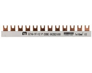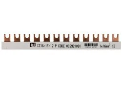 Szyna łączeniowa jest przeznaczona do połączenia 12 urządzeń. Została ona wykonana z miedzi o grubości 1,5 mm. Ponadto, izolacja szyny została zrobiona z samogasnącego PCV, odpornego na wysoką temperaturę. Produkt ma 210 mm długości i posiada 18-mm odstępy łączeniowe. Jednofazowa szyna łączeniowa pracuje przy znamionowym prądzie ciągłym Iu o wartości 100 A. Przekrój produktu ma 16 mm2.