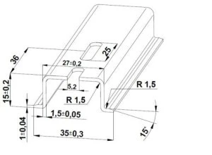 Szyna montażowa E451114 o wymiarach szer 35 mm x wys 15 mm x dł 1000 mm. Wykonanie perforowane 5,2x25mm. Materiał: stal. Wykończenie powierzchni szyny cynkowaniem Sendzimira. Szyna nośna DIN znormalizowana zgodnie z normą EN 60715. Zgodnie z Państwa życzeniem jesteśmy w stanie wykonać listwy o dowolnej długości oraz listwy z niestandardowymi otworami. Szyny montażowe o nietypowych długościach z otworami na końcach dostarczane są w opakowaniach po pięć sztuk.