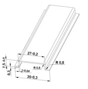 Szyna montażowa E151111 o wymiarach szer 35 mm x wys 7,5 mm x dł 1000 mm. Wykonanie pełne. Materiał: stal. Wykończenie powierzchni szyny cynkowaniem Sendzimira. Szyna nośna DIN znormalizowana zgodnie z normą EN 60715. Zgodnie z Państwa życzeniem jesteśmy w stanie wykonać listwy o dowolnej długości oraz listwy z niestandardowymi otworami. Szyny montażowe o nietypowych długościach z otworami na końcach dostarczane są w opakowaniach po pięć sztuk.