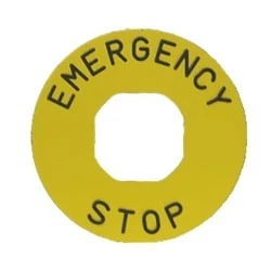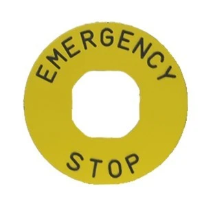 Tabliczka ostrzegawcza o średnicy 60 mm z napisem EMERGENCY STOP, z tworzywa.
