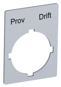 Tabliczka opisowa z oznaczeniem "Prov Drift" do aparatury przemysłowej ABB. Przeznaczona do montażu na przyciskach, lampkach sygnalizacyjnych i przełącznikach. Wykonana z trwałego materiału odpornego na ścieranie. Ułatwia identyfikację funkcji elementów sterujących.