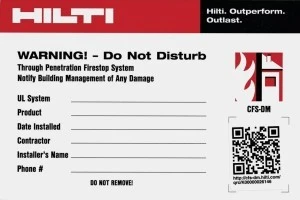 Tabliczki identyfikacyjne ułatwiają dokumentowanie montażu biernej ochrony przeciwpożarowej na potrzeby odbioru i konserwacji. Dzięki jednoznacznej identyfikacji każdego przepustu kabla/rury z zabezpieczeniem ogniochronnym można zapisywać harmonogramy konserwacji, dokładne położenie oraz szczegóły produktu.