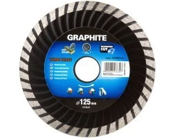 Tarcza diamentowa turbo wave GRAPHITE (nr ref. 57H634) o średnicy zewnętrznej 125 mm, dzięki prasowanym na gorąco segmentom typu TURBO idealnie nadaje się do ciężkich prac budowlanych. Specjalnie profilowany dysk tarczy w znaczący sposób poprawia chłodzenie w czasie pracy, wydłużając żywotność. Wysoko wytrzymałe segmenty diamentowe pozwalają wydajnie ciąć elementy wykonane z betonu, betonu zbrojonego, granitu, marmuru, kamienia, cegły itp.