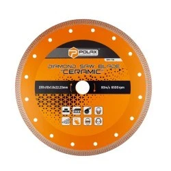Tarcze diamentowe Polax Ceramic dzięki zmniejszonej grubości (najcieńsze tarcze diamentowe w ofercie Polax) pozwalają ciąć szybciej i dokładniej, unikając odprysków i przy mniejszym obciążeniu szlifierki. Zapewniają precyzyjne i cienkie cięcia, a także szlifowanie krawędzi płytek. Tarcze przeznaczone są do cięcia na sucho i nie wymagają wymuszonego chłodzenia. Zoptymalizowany do cięcia gresu porcelanowego. Nadaje się również do cięcia płytek ceramicznych, płytek porcelanowych, marmuru, cegły, betonu, płytek, płyt chodnikowych i innych twardych materiałów. Wysoka koncentracja drobnych diamentów na krawędzi tnącej w kształcie litery X, a także minimalna możliwa grubość ściernicy, zapewnia minimalne tarcie w ciętym materiale, dużą prędkość cięcia i zwiększoną czystość krawędzi.