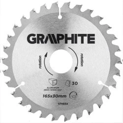 Tarcza do pilarki GRAPHITE (nr ref. 57H654) o średnicy zewnętrznej 165 mm wykonana ze stopu stali manganowej MN65 o dużej odporności na temperaturę i odkształcenia. Zęby z nakładkami z węglika spiekanego YG6A posiadają specjalne ostrzeniepudełko pozwala cięcia profili aluminiowych. Zawarte w opakowaniu pierścienie redukcyjne umożliwiają zastosowanie tarczy do większości modeli pilarek.