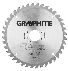 Tarcza do pilarki widiowa GRAPHITE (nr ref. 55H600 ) o średnicy zewnętrznej 185 mm, wykonana ze stopu stali manganowej MN65 o dużej odporności na temperaturę i odkształcenia. Zęby z nakładkami z węglika spiekanego YG6A pozwalają na zgrubne cięcie drewna i materiałów drewnopochodnych, takich jak sklejka, płyta wiórowa, MDF. Zawarte w opakowaniu pierścienie redukcyjne umożliwiają zastosowanie tarczy do większości modeli pilarek.
