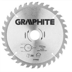 Tarcza do pilarki widiowa GRAPHITE (nr ref. 57H682) o średnicy zewnętrznej 205 mm wykonana ze stopu stali manganowej MN65 o dużej odporności na temperaturę i odkształcenia. Zęby z nakładkami z węglika spiekanego YG6A pozwalają na zgrubne cięcie drewna i materiałów drewnopochodnych takich jak sklejka płyta wiórowa MDF. Zawarte w opakowaniu pierścienie redukcyjne umożliwiają zastosowanie tarczy do większości modeli pilarek.