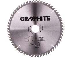 Tarcza do pilarki widiowa GRAPHITE (nr ref. 57H681) o średnicy zewnętrznej 216 mm wykonana ze stopu stali manganowej MN65 o dużej odporności na temperaturę i odkształcenia. Zęby z nakładkami z węglika spiekanego YG6A pozwalają na precyzyjne cięcie drewna i materiałów drewnopochodnych takich jak sklejka płyta wiórowa MDF. Zawarte w opakowaniu pierścienie redukcyjne umożliwiają zastosowanie tarczy do większości modeli pilarek.