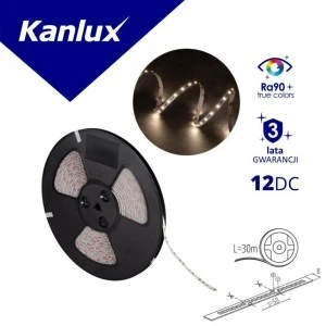 Liniowe moduły LED, zasilanie 12V DC, moc 11W/m, źródło światła LED SMD, strumień świetlny 900lm/m, barwa 4000K , trwałość 30000h, IP 00, możliwość dzielenia pasków LED na segmenty (50mm); pasek o długości 30m; szerokość 8mm.