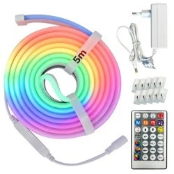 - W opakowaniu: rolka 5m z taśmą NEON LED, sterownik, zasilacz, pilot, zaczepy montażowe