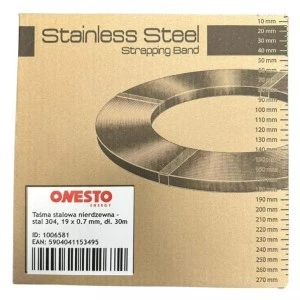 Taśma ze stali nierdzewnej 304 ONESTO o szerokości 19 mm i grubości 0,7 mm jest konfekcjonowana w zwoju 30 m w kartonowym opakowaniu.
