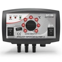 Regulator ST-19 antystop przeznaczony jest do sterowania pompą obiegu wody centralnego ogrzewania. Ustawianie temperatury zadanej dokonujemy za pomocą potencjometru. Zadaniem regulatora jest: załączanie pompy, jeśli temperatura uzyska zadaną wartość, oraz wyłączanie jej – jeśli piec wychłodzi się o 2°C poniżej zadanej. Taki tryb pracy zapobiega niepotrzebnemu działaniu pompy, co pozwala zaoszczędzić energię elektryczną oraz przedłuża żywotność pompy i podnosi jej niezawodność. Sterownik St-19 posiada również dodatkową funkcję ANTYSTOP, która zapobiega zastaniu pompy obiegowej poza sezonem (pompa załącza sie co ok. 10 dni na 1 minutę).