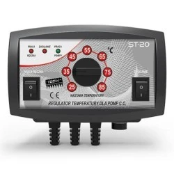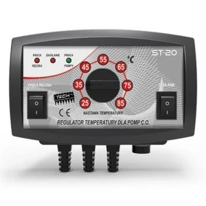 Regulator ST-20 przeznaczony jest do sterowania pompą obiegu wody centralnego ogrzewania. Ustawianie temperatury zadanej dokonujemy za pomocą potencjometru. Zadaniem regulatora jest: załączanie pompy, jeśli temperatura uzyska zadaną wartość, oraz wyłączanie jej – jeśli piec wychłodzi się o 2°C poniżej zadanej. Taki tryb pracy zapobiega niepotrzebnemu działaniu pompy, co pozwala zaoszczędzić energię elektryczną oraz przedłuża żywotność pompy i podnosi jej niezawodność.