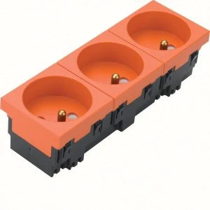 Gniazdo tehalit.GB-EG 2P+Z o kącie 33° w konfiguracji potrójnej, przeznaczone do instalacji elektrycznych wymagających modułowego układu gniazd. Produkt wykonany jest w wersji bezhalogenowej i występuje w kolorze pomarańczowym.