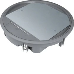 Okrągła pokrywa uchylna tehalit.VE-EE VR12 przeznaczona do montażu w podłogach podniesionych i przejściach kablowych; zaprojektowana dla wykładzin o grubości 12 mm i umożliwiająca osadzenie elementów instalacyjnych bez naruszania ciągłości podłogi.