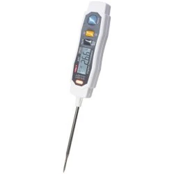 A61 to cyfrowy termometr igłowy/szpilkowy do wykonywania pomiarów wewnątrz substancji lub ciała stałego. Również można go używać do pomiary temperatury cieczy. Urządzenia umożliwia pomiar od -40°C do +250°C zarówno w stopniach Celsiusza jak i Fahrenheita. Za pomiar temperatury odpowiedzialny jest czujnik NTC. Stabilizacja pomiaru temperatury odbywa sie w ciągu 20s. Małe kompaktowe wymiary sprawiają że urządzenie idealnie nadaje się do ręcznej kontroli temperatury. Urządzenie posiada możliwość pomiaru wartości realnej, maksymalnej oraz minimalnej. Podświetlany ekran ze wskazaniem temperatury jest podświetlany. Urządzenie posiada funkcję data hold, wskaźnik baterii. Końcówka pomiarowa zakończona szpilką wykonana jest ze stali nierdzewnej SUS304. Klasa szczelności urządzenia IP65. Wytrzymały na upadek z wysokości 1m. Idealny do szybkiej kontroli oraz testów temperatury na produkcji oraz wszędzie tak gdzie temperatura ma znaczenie podczas procesów produkcyjnych.