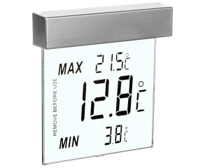 Cyfrowy termometr okienny z temperaturą na zewnątrz przedstawioną za pomocą dużych, czytelnych cyfr. Najwyższe i najniższe wartości w ciągu dnia są pokazywane jednocześnie obok, zawsze aktualne. Prosty montaż: wystarczy zamontować uchwyt do okna i dodać termometr. Aby umyć okna lub wymienić baterię, termometr można łatwo zdjąć.