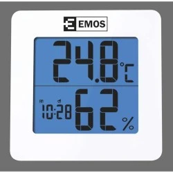 Termometr w białej obudowie z zegarem stabilizowanym kryształem kwarcu. Termometr ma podświetlony wyświetlacz, pokazuje temperaturę wewnętrzną i wilgotność, czas, datę i posiada budzik.