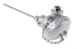 PRT z głowicą KNE i nadajnikiem. Termometr bezprzewodowy klasy B typu B typu PT100 z głowicą KNE i nadajnikiem. Dostępny w próbówce o długości 150 mm Średnica 6 mm w 316 stali nierdzewnej Dostępnych jest kilka zakresów nadajnika IP67 Głowica połączeniowa odporna na warunki atmosferyczne ze stopu aluminium Temperatura znamionowa czujnika od -100 °C do +450 °C. Spełnia wymogi normy IEC 751